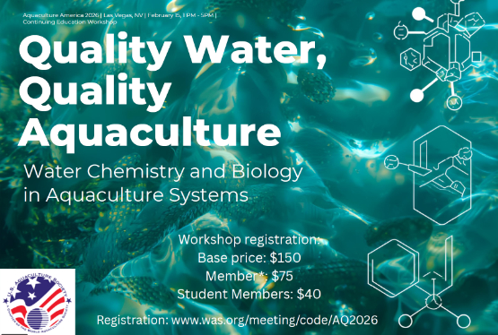 The United States Aquaculture Society (USAS) has organized a water quality workshop to take place the Monday (February 16, 2026) prior to the start of Aquaculture America 2026. You can include the workshop as part of the registration for the meeting...